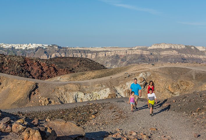 Galvanize your adventurous spirit and journey into the beating, volcanic heart of Santorini. Board a guided cruise to Nea Kameni for a hike, over lava fragments, up to the spectacular rim of the island’s crater. Then sail to nearby Palea Kameni for a revitalizing swim in warm thermal waters. Return to Santorini for a cable car up to the town of Fira for panoramic views, shopping and independent exploration